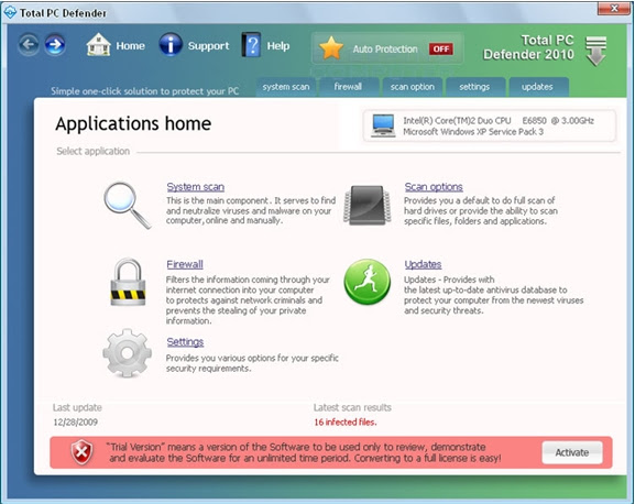 PC Defender since 2008 is known as an anti virus / anti spyware fake made by used by the "online scammers" to manipulate the user's Microsoft Windows operating system. Application seems to act like antivirus tools are useful, however, its function is mischievous and misleading because it is basically trying to steal money and personal data from unsuspecting users. The software is usually distributed with the help of Trojans and other forms of malicious software such as fake codec pack and browser page is misleading.